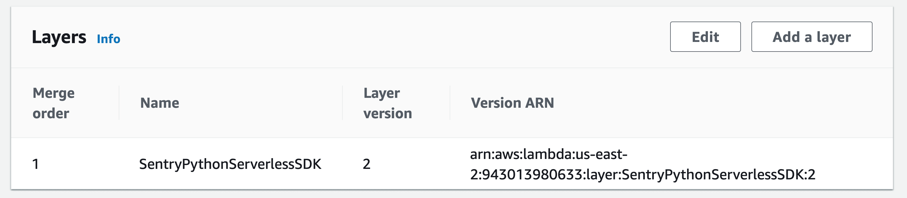 • The layer for Sentry is added to your Lambdas. Any existing layers are honored and the Sentry layer is appended to the end.